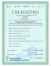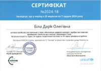- ГО "Заходи". Навчання з теми "Ментальне здоров'я молоді" з 25.09.2024 по 7.12.2024. Сертифікат № 2024-18 (43 год.).