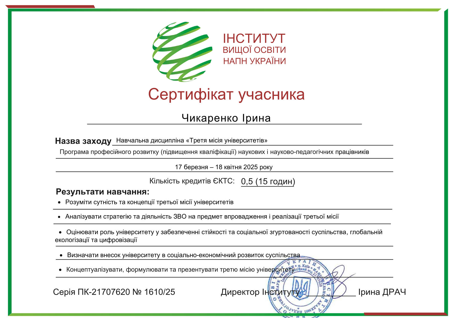 - Університет Генуї (Італія), Центр досконалості Жана Монне «Європейські Студії соціальних інновацій в освіті» в УДУ імені Михайла Драгоманова. Участь в е-курсі «Третя місія університетів / Third Mission of Universities» за проєктом Jean Monnet Centre of Excellence ESSIE - 101085552 - ERASMUS-JMO-2022-COE. 17.03-18.04.2025. Сертифікат №2025TMU06-000180 (30/1.0)