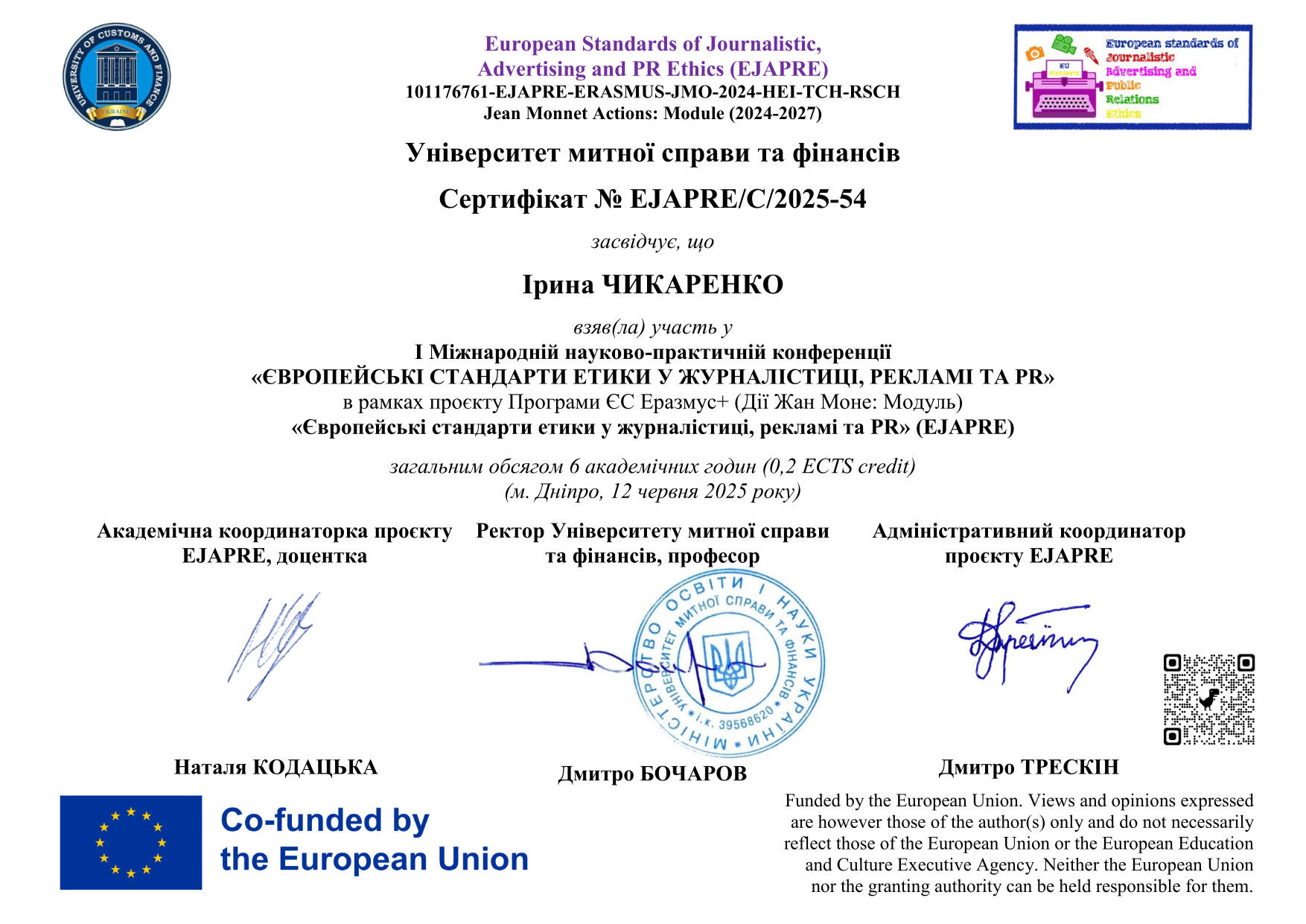 - Університет митної справи та фінансів. Участь у І Міжнародній науково-практичній конференції «Європейські стандарти етики у журналістиці, рекламі та PR» в рамках проєкту Програми ЄС Еразмус+ (Дії Жан Моне: Модуль) «Європейські стандарти етики у журналістиці, рекламі та PR» (EJAPRE). 12.06.2025. Сертифікат № EJAPRE/C/2025-54 (6 год. / 0,2 кред.)