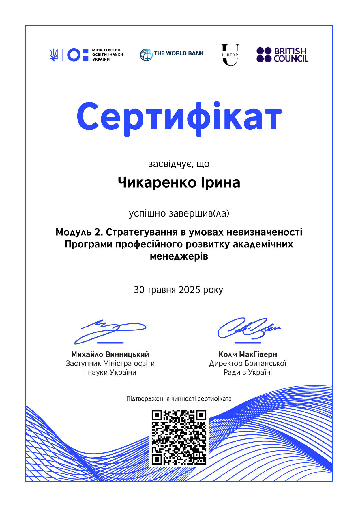 - Проєкт Світового Банку «UIHERP – Ukraine Improving Higher Education for Results Project». Міністерство освіти і науки України, World Bank, British Council. Програма професійного розвитку академічних менеджерів. Модуль 2. Стратегування в умовах невизначеностей Програми професійного розвитку академічних менеджерів. 30.04-03.05.2025. Сертифікат від 30.05.2025 (45 / 1.5)
