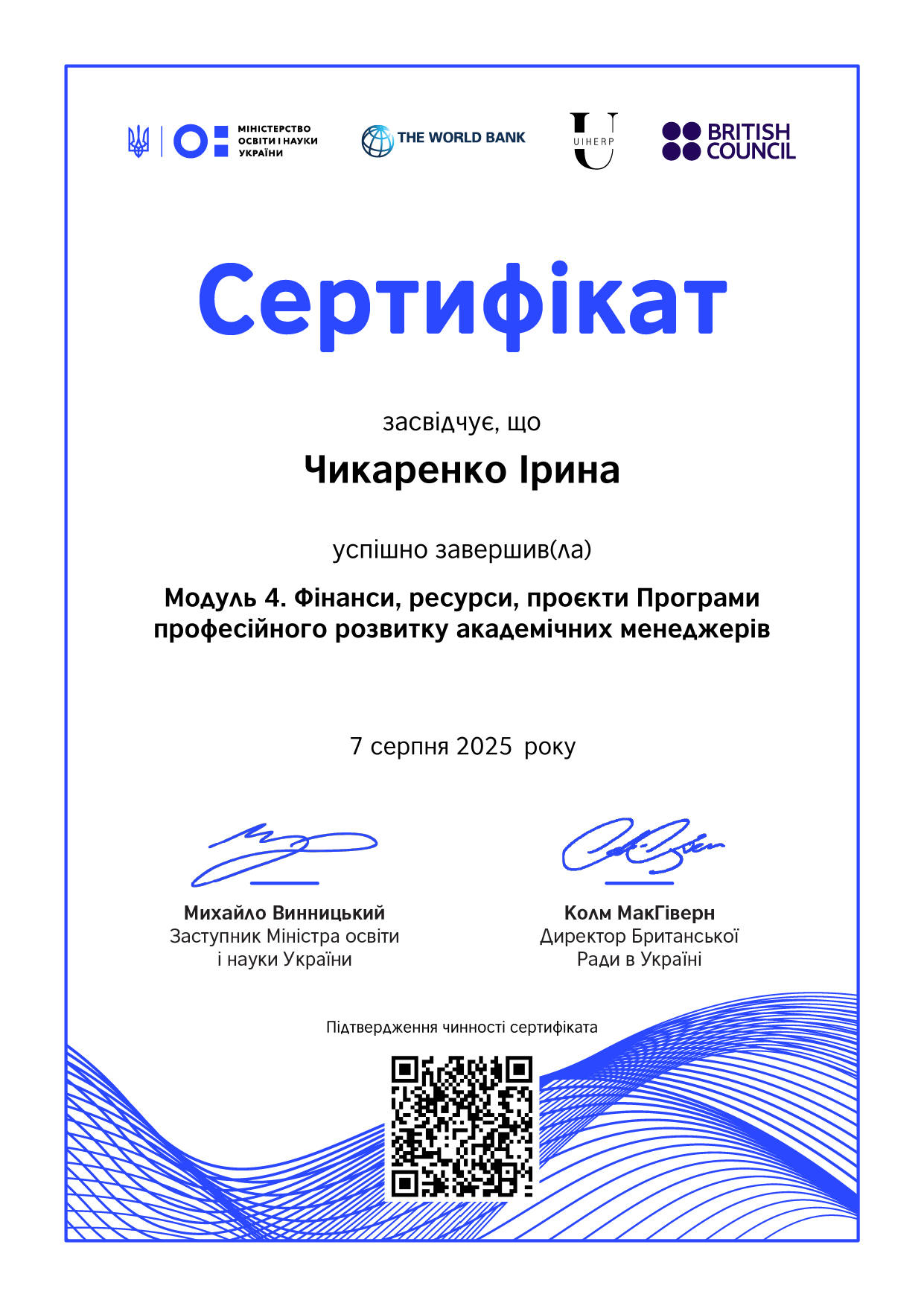 - Проєкт Світового Банку «UIHERP – Ukraine Improving Higher Education for Results Project». Міністерство освіти і науки України, World Bank, British Council. Програма професійного розвитку академічних менеджерів. Модуль 4. Фінанси. Ресурси. Проєкти.. 28.07-02.08.2025. Сертифікат від 07.08.2025 (45 / 1.5)