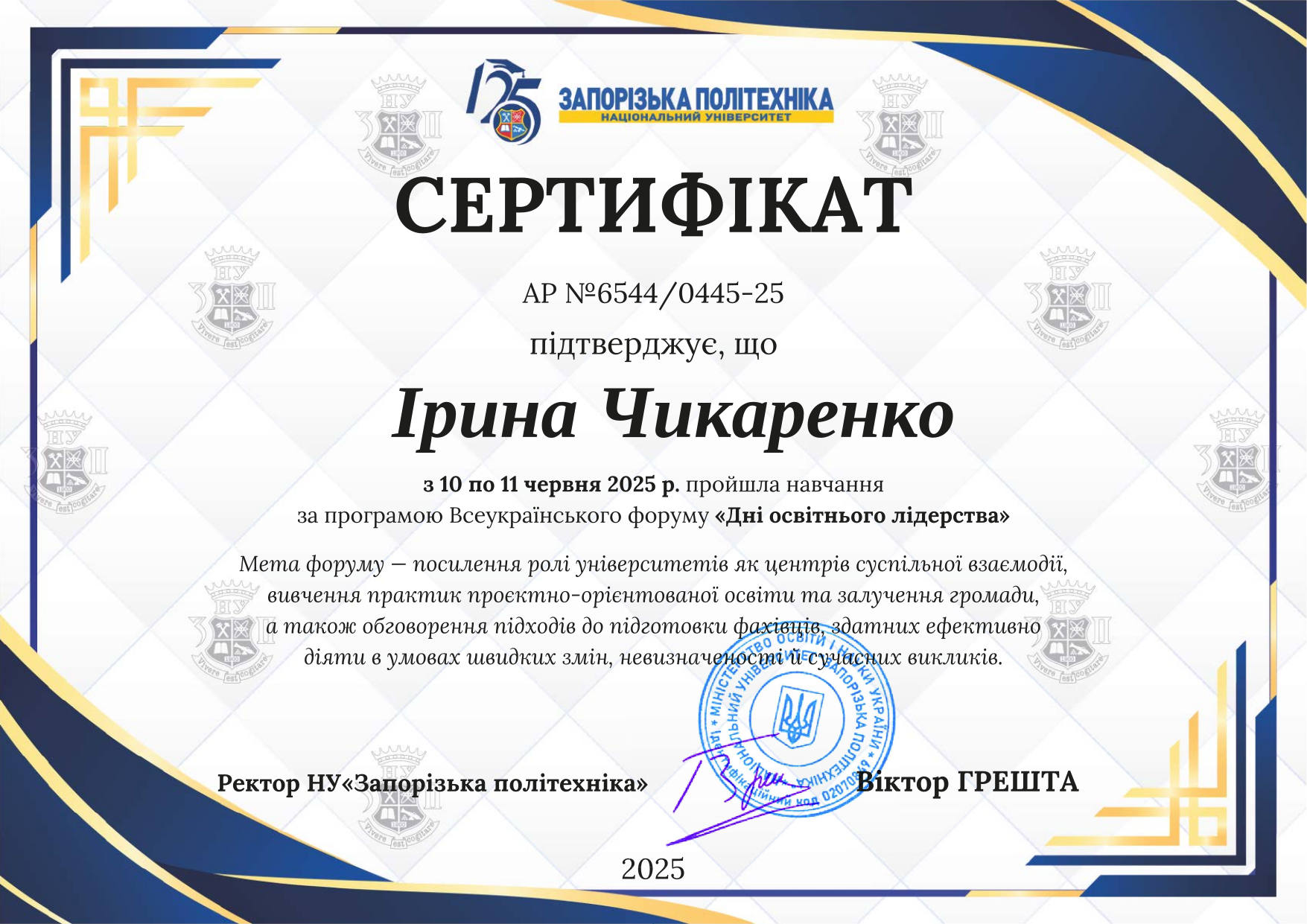 - Національний університет «Запорізька політехніка». Участь у Всеукраїнському форумі «Дні освітнього лідерства». 10.06.2025 – 11.06.2025. Сертифікат АР № 6544/0445-25 (15 / 0.5)