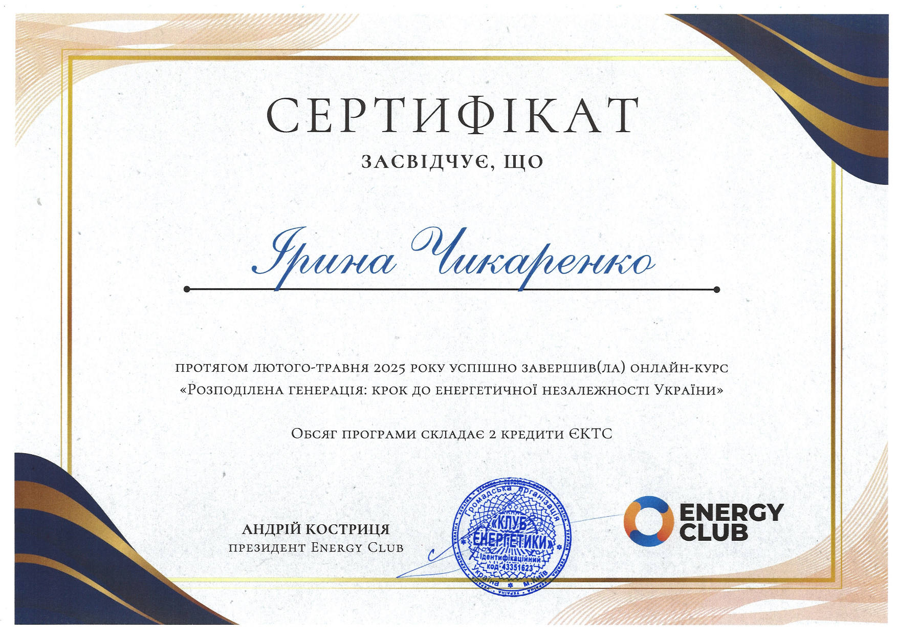 - ENERGY CLUB: Об'єднання провідних компаній енергетичної галузі України, м. Київ. Навчальний курс «Розподілена генерація: крок до енергетичної незалежності України». Лютий-травень 2025. Сертифікат від 15.07.2025 (2 / 60)