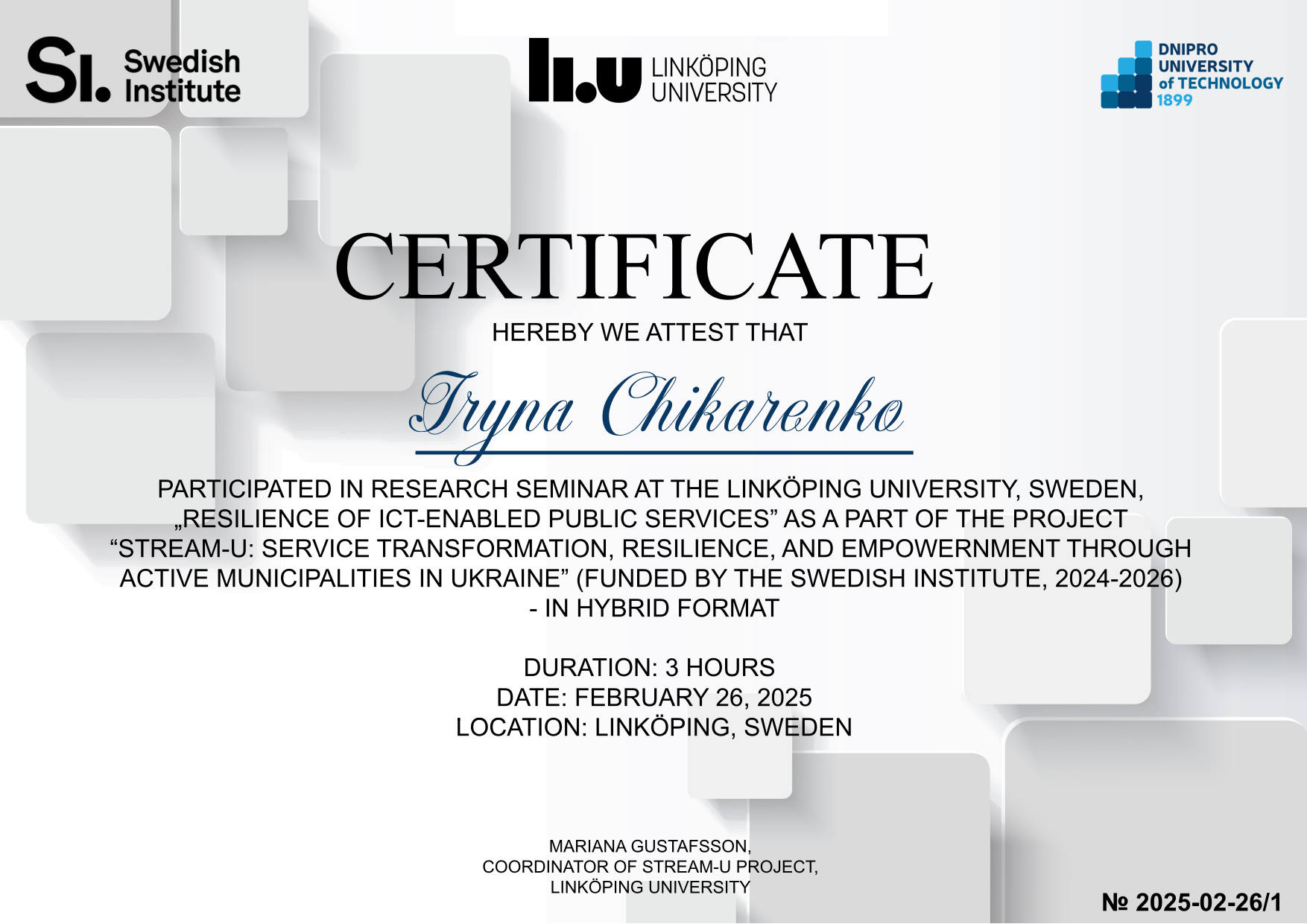 - Linköping University, Sweden. Рarticipated in research seminar at the Linköping University, Sweden, „Resilience of ict-enabled public services” as apartof the project “Stream-U: Service transformation, resilience, and empowernment through active municipalities in Ukraine” (funded by the Swedish Institute, 2024-2026). 26.02.2025. Certificate: № 2025-02-26/1 (3 hour / 0.1 cred.)