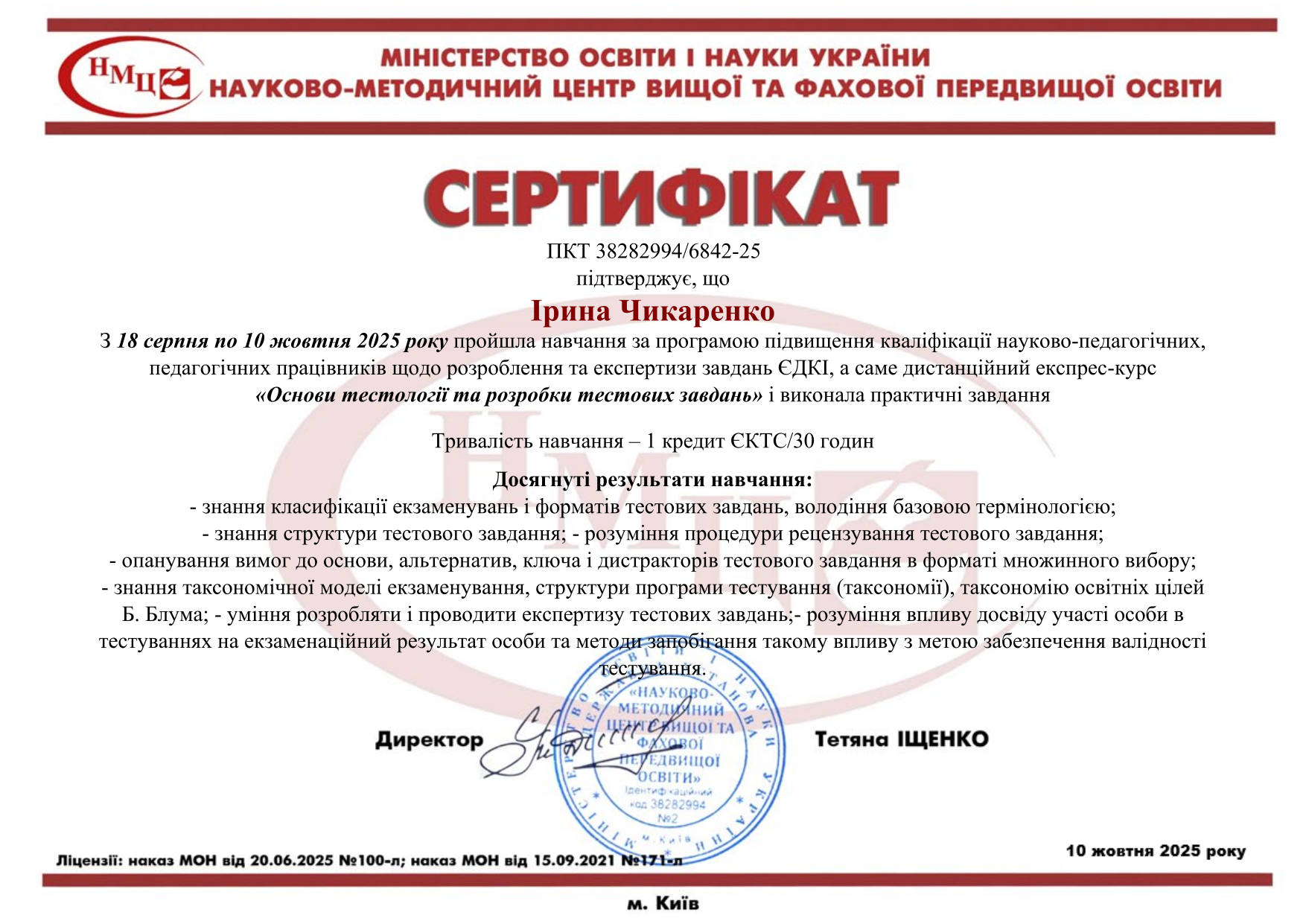 - Науково-методичний центр вищої та фахової передвищої освіти МОН України. Навчання за програмою підвищення кваліфікації науково-педагогічних працівників щодо розроблення та експертизи завдань ЄДКІ: дистанційний експрес-курс «основи тестології та розробки тестових завдань». 18.08. –10.10.2025. Сертифікат ПКТ 38282994/6842-25 (30 год / 1 кред.)