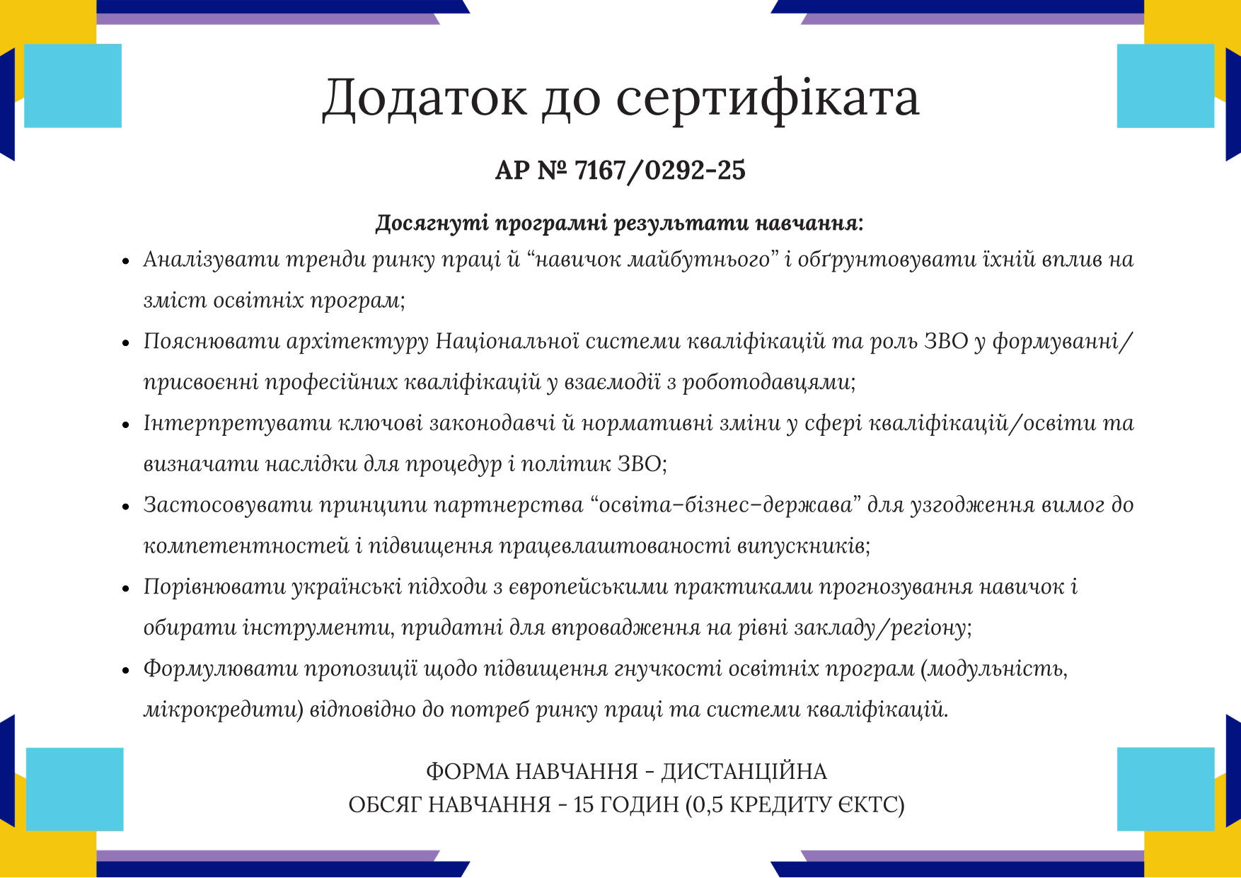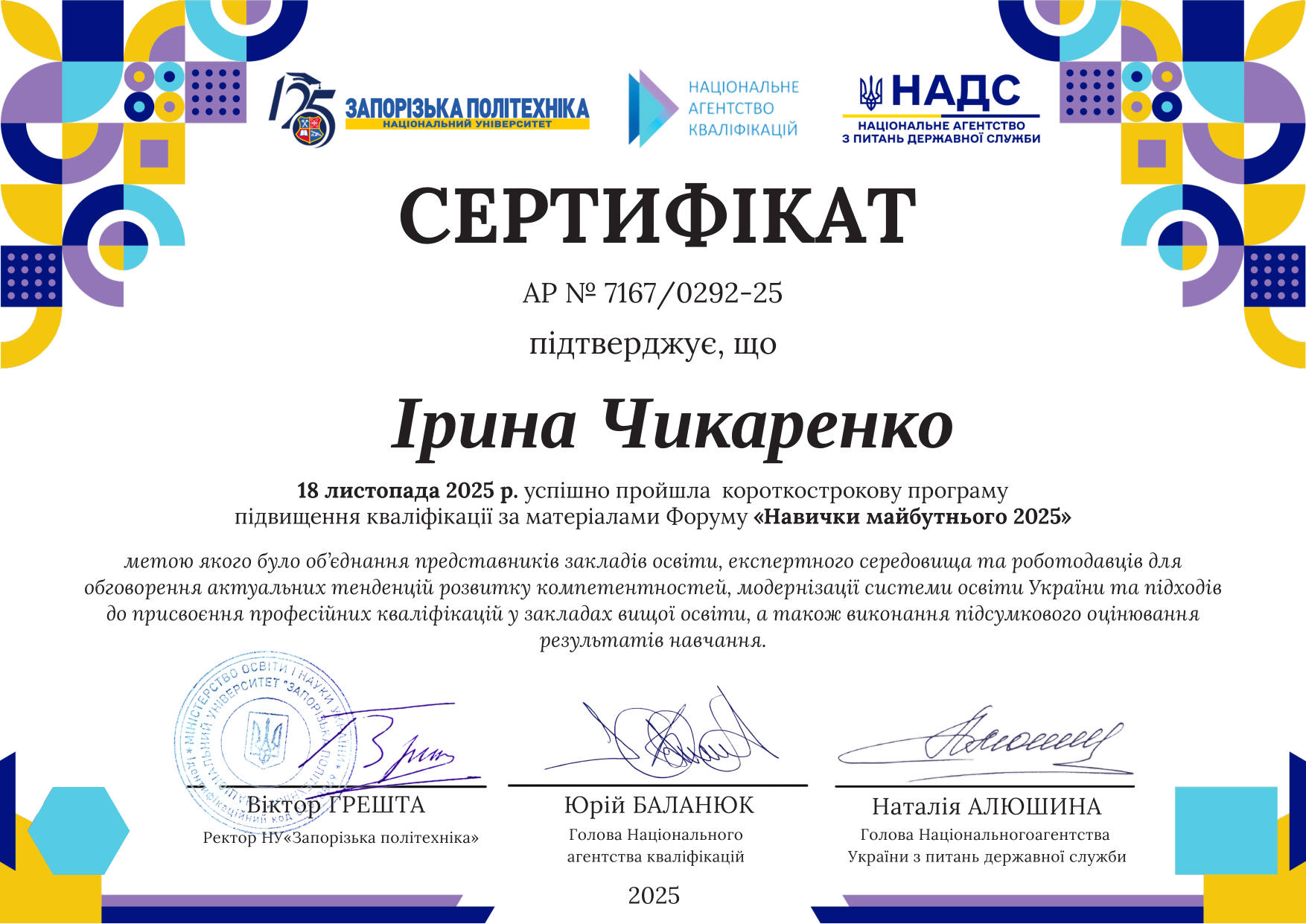 - Національний університет «Запорізька політехніка», Національне агентство кваліфікацій, НАДС, Короткострокова програма підвищення кваліфікації за матеріалами Форуму «Навички майбутнього 2025», 18.11.2026, сертифікат АР 7167/0292-25 (15 год. / 0.5 кред.).