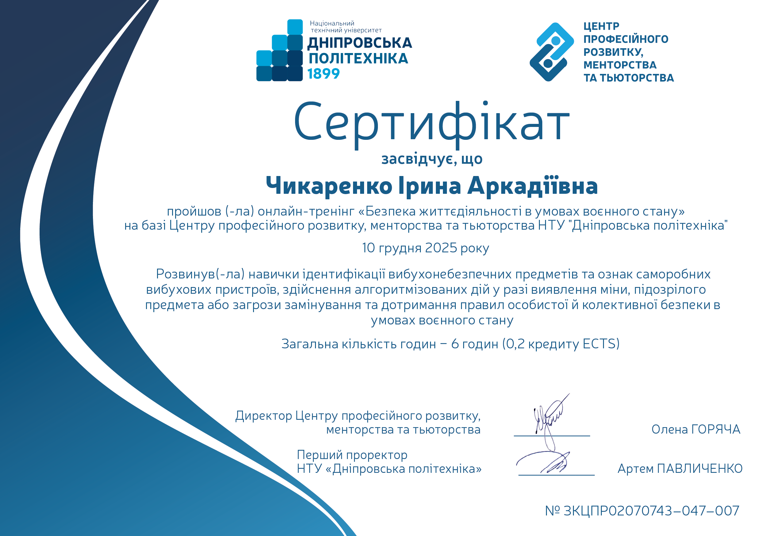 - Центр професійного розвитку, менторства та тьюторства НТУ «Дніпровська політехніка», Онлайн-тренінг «Безпека життєдіяльності в умовах воєнного стану». 10.12.2025. Сертифікат NºЗКЦПР02070743-047-0076 год. / 0,2 кред.
