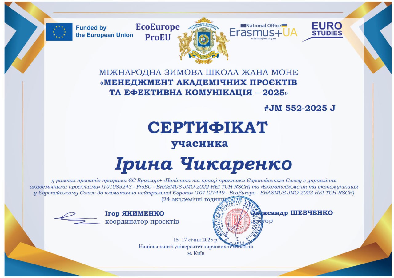 - Програма ЄС Еразмус+ «Політика та кращі практики ЄС з управління академічними проєктами»; «Екоменеджмент та екокомунікація в ЄС: до кліматично нейтральної Європи». Участь у Міжнародній зимовій школі «Менеджмент академічних проєктів та ефективна комунікація – 2025», 15-17.01.2025, сертифікат № #JM 552-2025 J (24 год / 0.8 кред.)