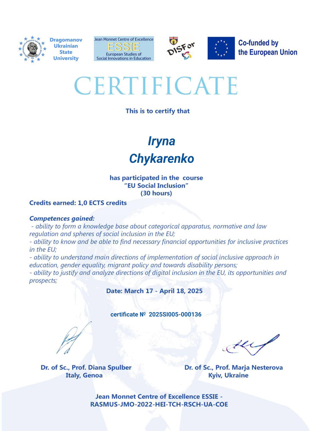 - Університет Генуї (Італія), Центр досконалості Жана Монне «Європейські Студії соціальних інновацій в освіті» в УДУ імені Михайла Драгоманова. Участь в е-курсі «Соціальна інклюзія / EU Social Inclusion» за проєктом Jean Monnet Centre of Excellence ESSIE - 101085552 - ERASMUS-JMO-2022-COE 17.03.2025-18.04.2025. Certificate № 2025SI005-000136 (30/1.0)