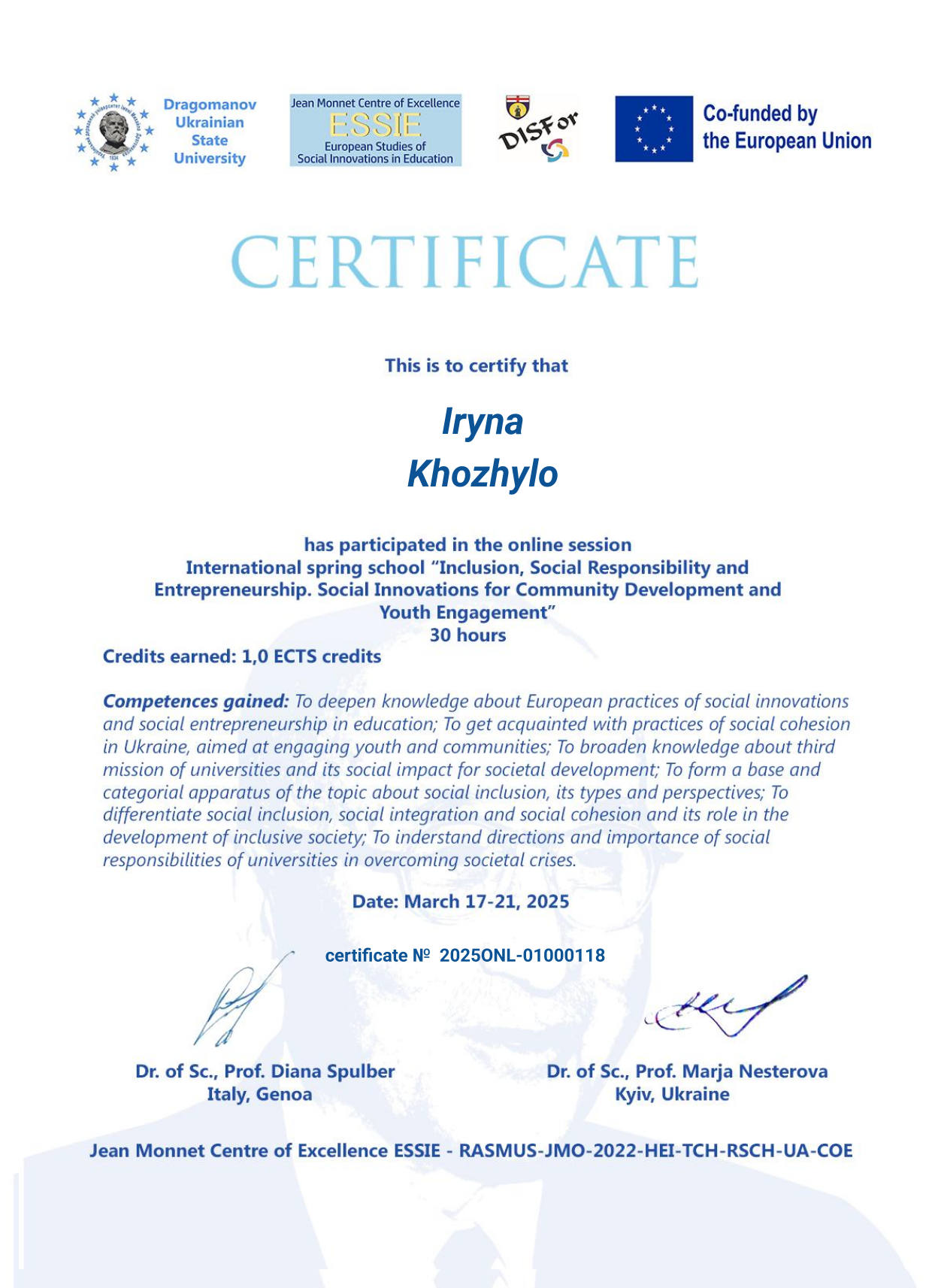 - Міжнародна весняна школа «Інклюзія, соціальна відповідальність та підприємництво. Соціальні інновації для розвитку громад та залучення молоді» - сертифікат