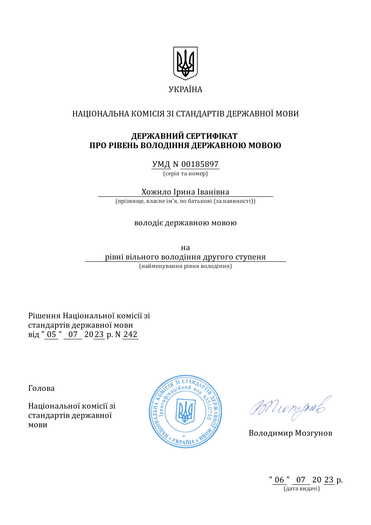 - Рівень вільного володіння польською мовою (В2), сертифікат.