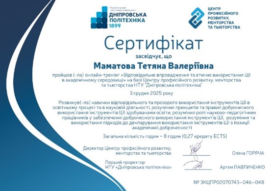 - Центр професійного розвитку, менторства та тьюторства НТУ «Дніпровська політехніка», Сертифікат ЗКЦПРО2070743-046-048, Онлайн-тренінг «Відповідальне впровадження та етичне використання ШІ в академічному середовищі», 03.12.2025, 8 год. / 0,27 кред. ЄКТС.