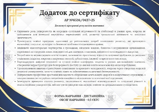 - Сертифікат № 2025TMU06-000099, Участь в е-курсі «Третя місія університетів / Third Mission of Universities», 30 год. / 1 кред. ЄКТС;