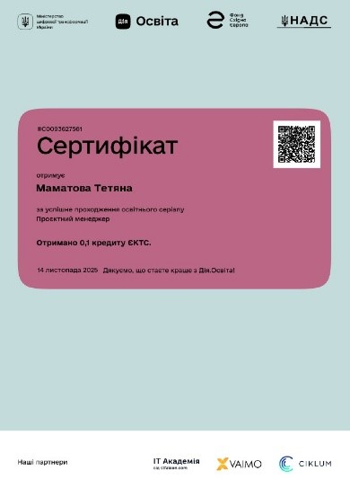 - Міністерство цифрової трансформації України, Національне агентство України з питань державної служби, Сертифікат #C0093627561, Проходження освітнього серіалу на платформі Дія.Освіта «Проектний менеджер», 14.11.2025, 0,1 кред. ЄКТС / 3 год.