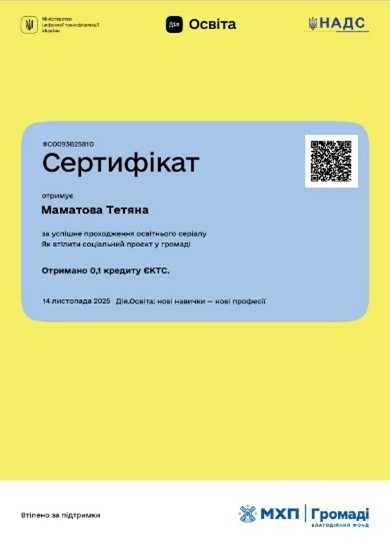 - Міністерство цифрової трансформації України, Національне агентство України з питань державної служби, Сертифікат #C0093625810, Проходження освітнього серіалу на платформі Дія.Освіта «Як втілити соціальний проект у громаді», 14.11.2025, 0,1 кред. ЄКТС / 3 год.