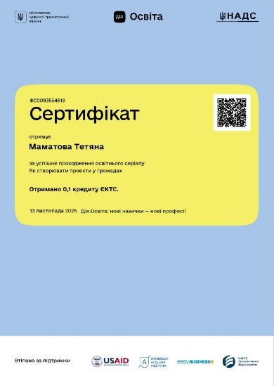 - Міністерство цифрової трансформації України, Національне агентство України з питань державної служби, Сертифікат #C0093554619, Проходження освітнього серіалу на платформі Дія.Освіта «Як створювати проекти у громадах», 13.11.2025, 0,1 кред. ЄКТС / 3 год.