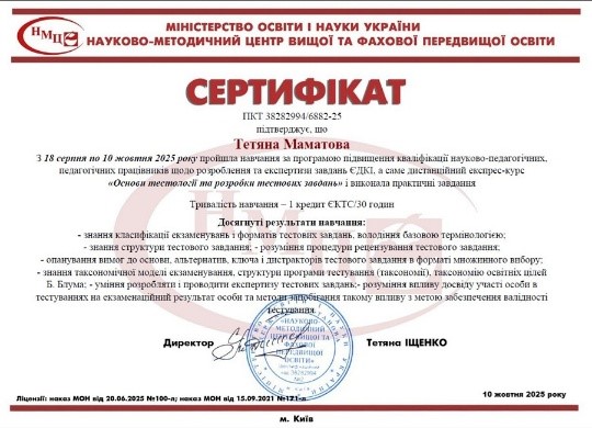 - Науково-методичний центр вищої та фахової передвищої освіти МОН України, Сертифікат ПКТ 38282994/6882-25, Навчання за програмою підвищення кваліфікації науково-педагогічних працівників щодо розроблення та експертизи завдань ЄДКІ: дистанційний експрес-курс «Основи тестології та розробки тестових завдань», 17-18.09.2025, 1 кред. ЄКТС / 30 год.