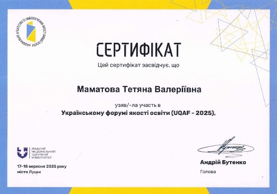 - Національне агентство із забезпечення якості вищої освіти, Луцький національний технічний університет, Сертифікат б/н, Участь в Українському форумі якості освіти (UQAF-2025), 17-18.09.2025, 0,5 кред. ЄКТС / 15 год.