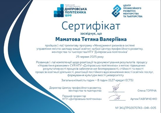 - Центр професійного розвитку, менторства та тьюторства НТУ «Дніпровська політехніка», Сертифікат № ЗКЦПР02070743-041-005, Онлайн-тренінг «Менеджмент ризиків в системі управління якістю закладу вищої освіти», 25.06.2025, 0,27 кред. ЄКТС / 8 год.