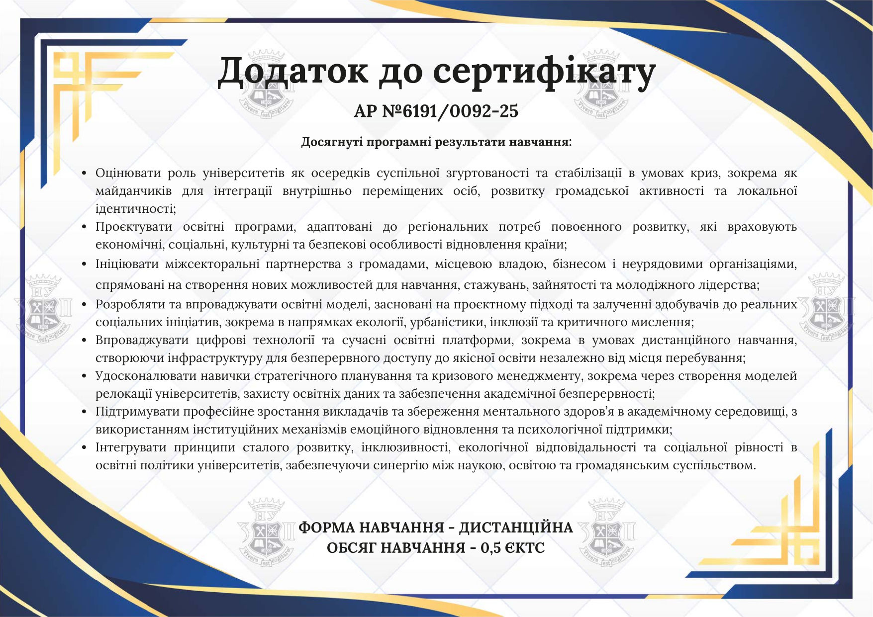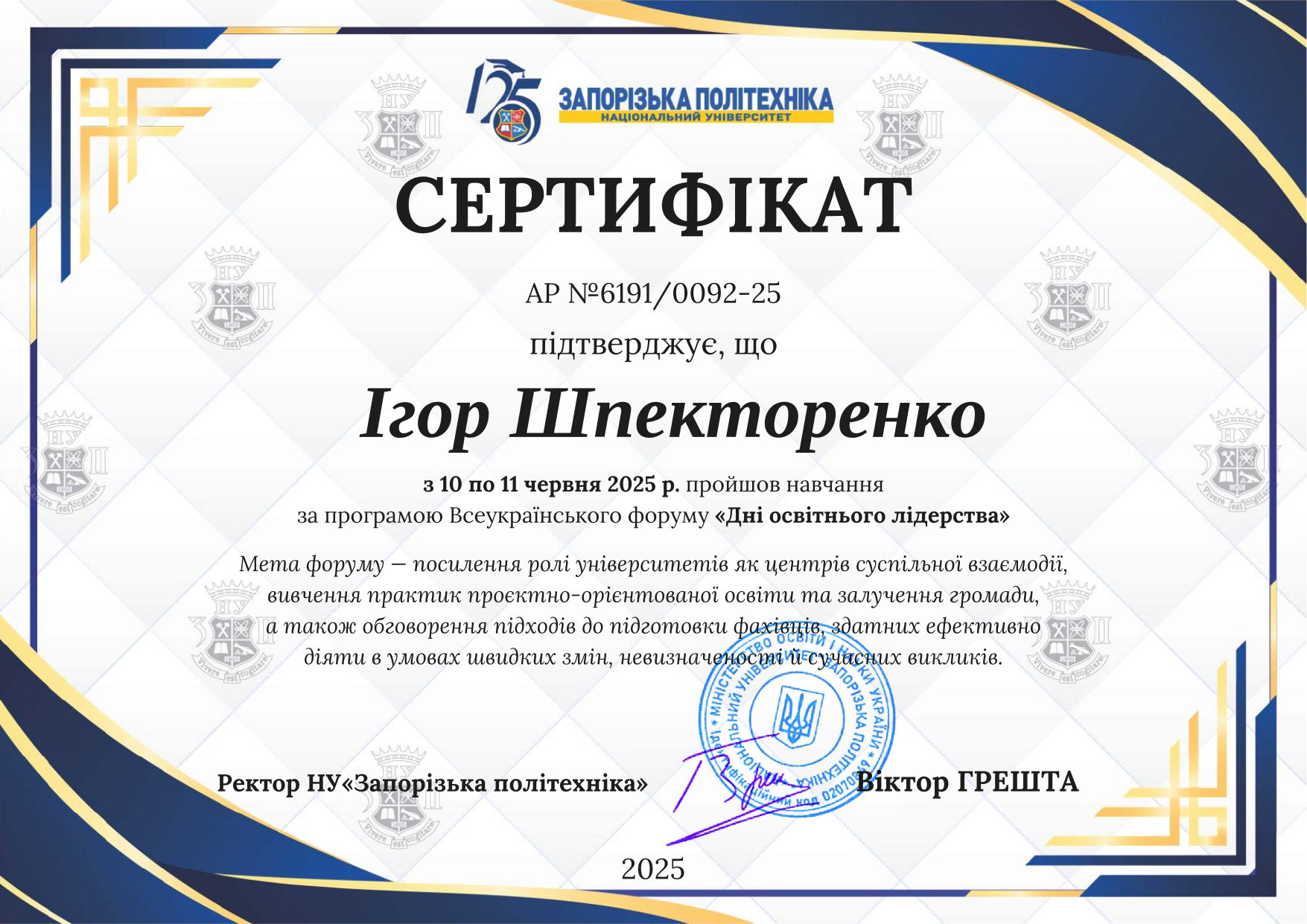 - Національний університет «Запорізька політехніка». 10-11 червня 2025 р. Всеукраїнський форум «Дні освітнього лідерства». (0,5 кредиту ECTS). Сертифікат АР № 6191/0092-25.