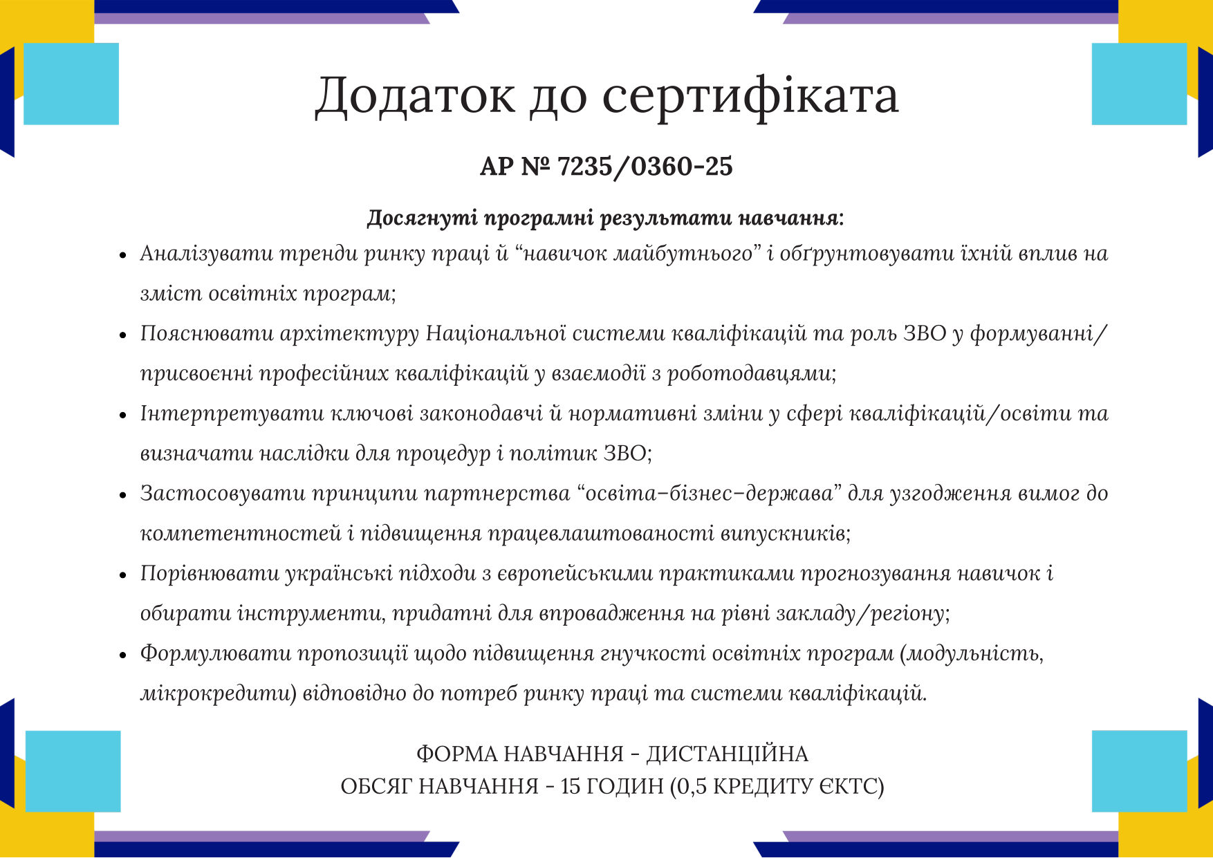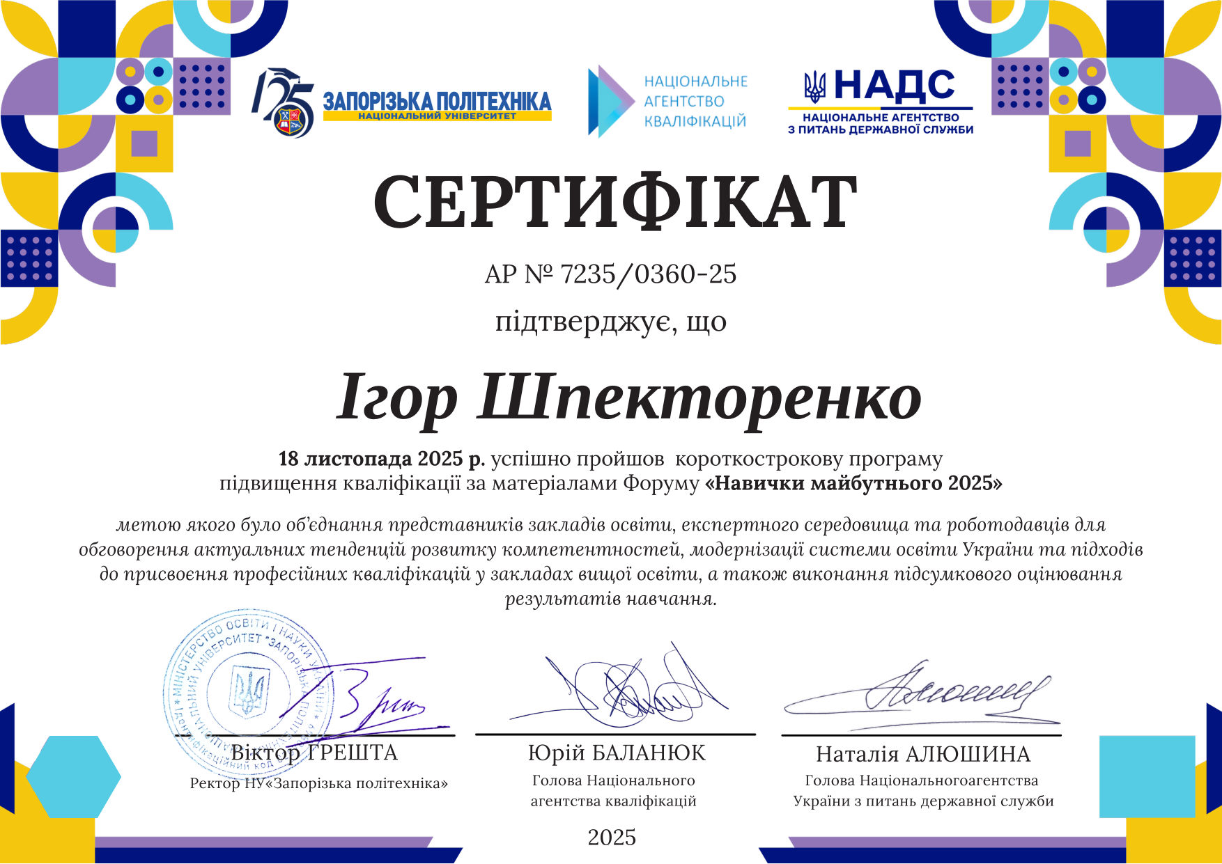 - Національний університет «Запорізька політехніка», Національне агентство кваліфікацій, НАДС. 18 листопада 2025 р., Форум «Навички майбутнього 2025» (0,5 кредиту ECTS). Сертифікат АР № 7235/0360-25.