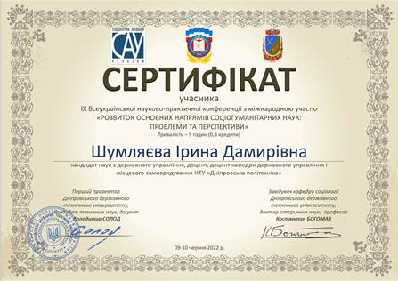 - ІХ Всеукраїнська наук.-практ. конф. з міжнар. участю «Розвиток основних напрямів соціогуманітарних наук: проблеми та перспективи» 09-10 червня 2022 р. (сертифікат учасника від 09-10 червня 2022 р.).