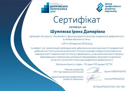 - Центр професійного розвитку персоналу НТУ Дніпровська політехніка», сертифікат. Тема: «Особливості функціонування культури академічної доброчесності в умовах воєнного стану», 29-30.03.2023, Сертифікат № ЗКЦПР02070743-012-105, 0,5 кред. ЄКТС/15 год.