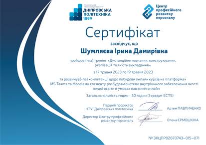 - Центр професійного розвитку персоналу НТУ Дніпровська політехніка», сертифікат. Тема: «Дистанційне навчання: конструювання, реалізація та якість викладання», 17-19.05. 2023, сертифікат № ЗКЦПР02070743-015-071, 1 кред. ЄКТС/30 год.