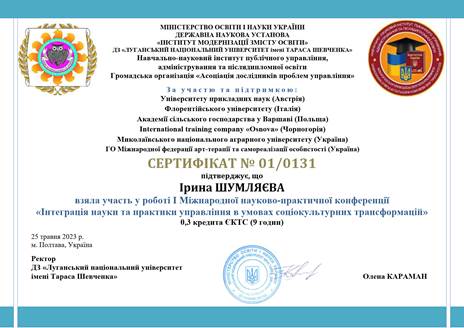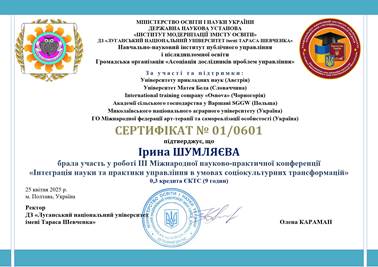 - Кабінет Міністрів України, ДНУ «Інститут модернізації змісту освіти», ДЗ «Луганський національний університет імені Тараса Шевченка», Громадська організація «Асоціація дослідників проблем управління», сертифікат. Тема: «Інтеграція науки та практики управління в умовах соціокультурних трансформацій», 25.04.2025 р., сертифікат №01/0601, 0,3 кред. ЄКТС/ 9 год.