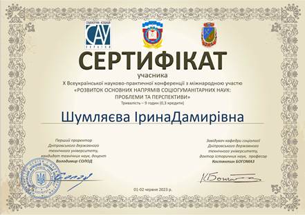 - Дніпропетровський технічний державний університет, сертифікат. Тема: «Розвиток основних напрямів соціогуманітарних наук: проблеми та песпективи», 1-02.06.2023 р., 0,3 кред. ЄКТС/9 год.