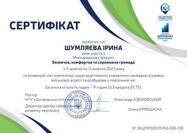 - Центр професійного розвитку персоналу НТУ Дніпровська політехніка», сертифікат. Тема: «Безпечна, комфортна та спроможна громада», 11-13.10.2023, сертифікат № ЗКЦПР02070743-018-139, 0,3 кред. ЄКТС/9 год.