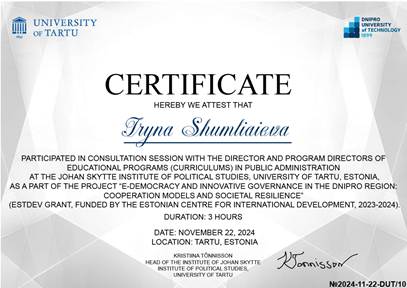 - Університет Тарту (University of Tartu, Estonia), сертифікат. Тема: «E-democracy and innovative governance in the Dnipro region: cooperation modelsand societal resilience» (Estdev grant, funded by the Estonian centre for international development, 2023-2024), 22.11.2024, Сертифікат № 2024-11 -22-DUN/10, 0,3 кред. ЄКТС/9 год.