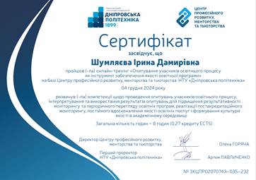 - Центр професійного розвитку, менторства та тьюторства НТУ «Дніпровська політехніка», сертифікат. Тема: «Опитування учасників освітнього процесу як інструмент забезпечення якості освітньої програми», 4.12.2024, сертифікат № ЗКЦПР02070743-035-232, 0,27 кред. ЄКТС/8 год.