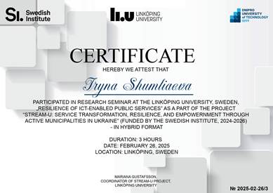 - Університет Лінчопінгу (Швеція), сертифікат. Тема: «Resilience ofict-enabled public services» в рамках проєкту «Stream-u: service transformation, resilience, and empowernment through active municipalitiesin Ukraine», 26.02.2025, сертифікат № 2025-02-26/3, 0,3 кред. ЄКТС/9 год.