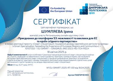 - Центр професійного розвитку, менторства та тьюторства НТУ «Дніпровська політехніка», сертифікат. Тема: «Приєднання до платформи S3: можливості та виклики для ЄС та країн cxiдного партнерства», 18.04.2025, сертифікат № EU-SMART-2025-RT-051, 0,27 кред. ЄКТС/8 год.