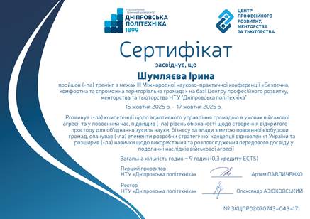 - Центр професійного розвитку, менторства та тьюторства НТУ «Дніпровська політехніка», сертифікат. Тема: «Безпечна, комфортна та спроможна громада», 15-18.10.2025, сертифікат № ЗКЦПР02070743-043-171, 0,3 кред. ЄКТС/9 год.